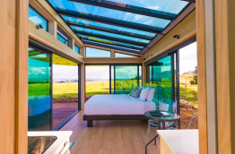 Il dispose d’une kitchenette équipée d’un réfrigérateur, de plaques de cuisson et du nécessaire à thé et à café, d’un système de chauffage biocombustible qui maintient la chaleur sur le sol en verre et d’un lit queen-size très confortable.
