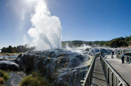 Vous pourrez observer la spectaculaire activité géothermique du site avec ses piscines de boue bouillonnante et son impressionnant geyser Pohutu, dont le jet d'eau peut atteindre jusqu'à 30 m de hauteur. Il s'agit du plus important geyser actif de Nouvelle-Zélande. Votre excursion se poursuit dans les environs du lac Rotorua pour observer un canoë de guerre traditionnel maori, l'occasion d'approfondir vos connaissances sur l'histoire et les traditions de ce peuple. Vous découvrirez ensuite les lacs de cratère tranquilles aux eaux limpides de cette région volcanique, comprenant le lac Okareka et les lacs bleu et vert, avec une vue sur le majestueux Mont Tarawera. Votre guide vous parlera de l'histoire de ce volcan, de la terrible éruption qui dévasta la zone en 1886 et des légendes qui en sont issues.